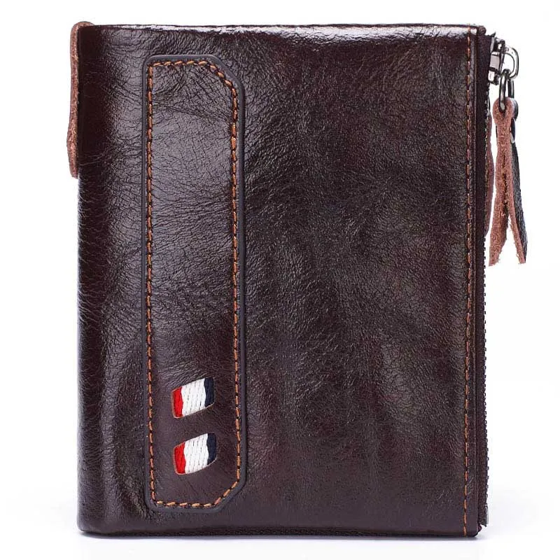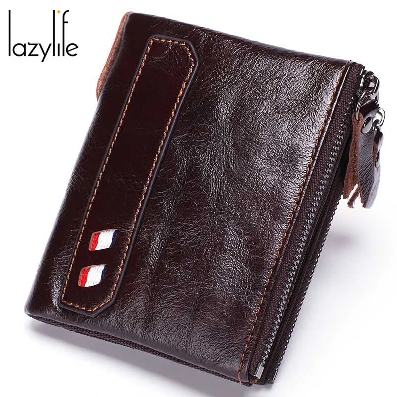 LAZYLIFE Crazy Horse Genuine Leather Men Wallets Credit Business Card Holders Double Zipper Cowhide