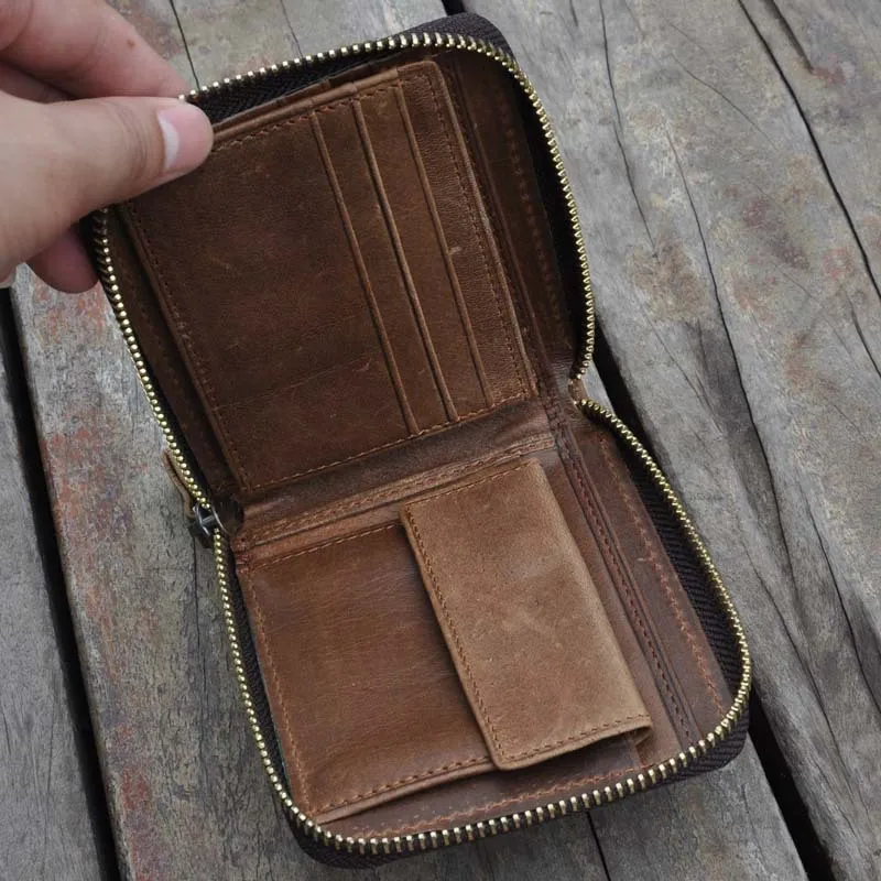 REVIEW TOP SELLER MEN'S Leather Wallet Zipper Coin Purse Coin Pocket Horse Leather Full-grain Leather Retro Multi Car