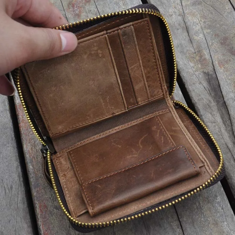 HOT SALE MEN'S Leather Wallet Zipper Coin Purse Coin Pocket Horse Leather Full-grain Leather Retro Multi Car