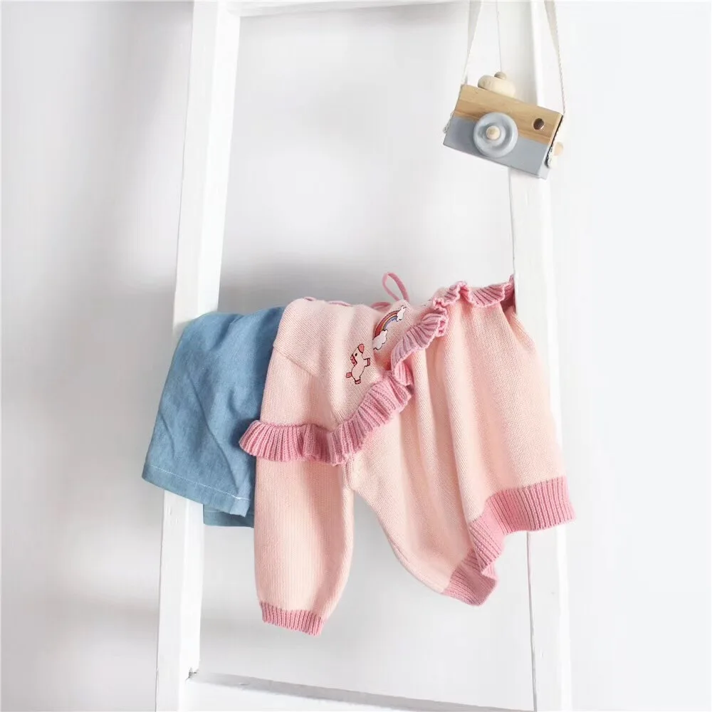 baby girls sweater pink color embroidered horse ruffles sweet toddler infant knitted tops